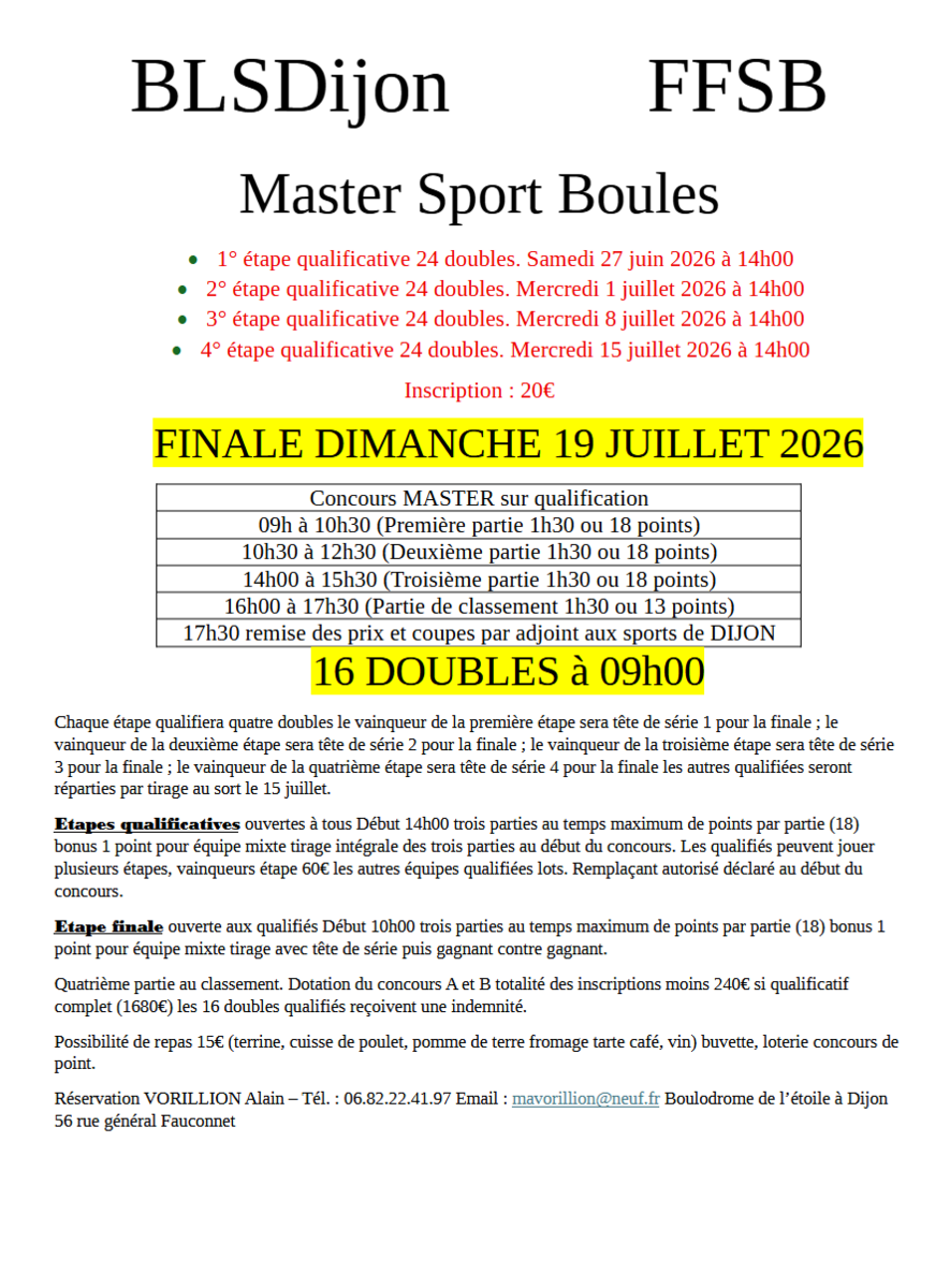 Réservation VORILLION Alain – Tél. : 06.82.22.41.97 Email : mavorillion@neuf.fr Boulodrome de l’étoile à Dijon 56 rue général Fauconnet